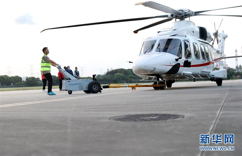 10月20日,参加进博会展出的意大利莱奥纳多直升机公司AW189型直升机降落在上海高东直升机常新华社记者 方喆 摄