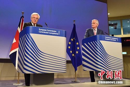当地时间3月19日,脱欧谈判欧盟首席谈判代表巴尼耶(图右)与英国脱欧事务大臣戴维斯(图左)共见记者,宣布双方迈出“决定性一步”,就脱欧过渡期安排等议题达成协议,但棘手的英国北爱尔兰与爱尔兰边界问题仍悬而未决。中新社记者 德永健 摄