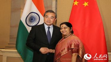 6月4日,国务委员兼外交部长王毅在南非出席金砖国家外长正式会晤期间会见印度外长斯瓦拉杰。 李志伟摄 人民网比勒陀利亚6月4日电 (记者李志伟……