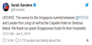 人民网北京6月6日电(姚丽娟) 美国总统特朗普与朝鲜最高领导人金正恩的首次会面将于6月12日在新加坡举行。美国白宫5日公布了美朝领导人会晤的……