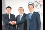 图为1月20日,韩国代表团团长都钟焕(右)和朝鲜代表团团长金一国在国际奥委会主席巴赫(中)主持的欢迎仪式上握手。……