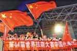 图为日前在阿拉伯联合酋长国举行的第44届世界技能大赛开幕式上,人们挥舞着中国国旗欢迎中国代表团入场。