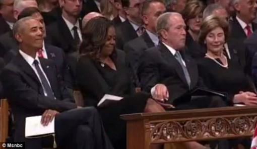 小布什在麦凯恩追悼会上给米歇尔传糖,美国网友被暖到了