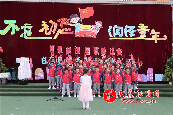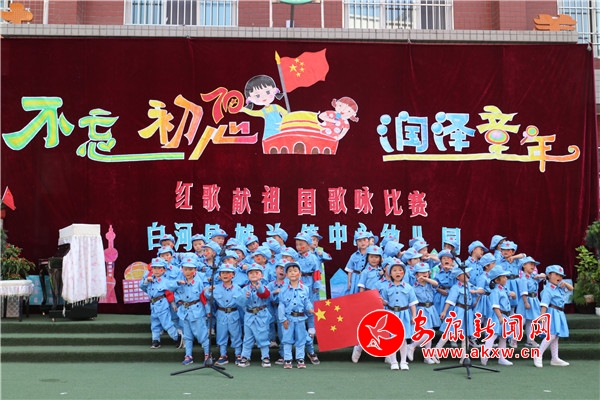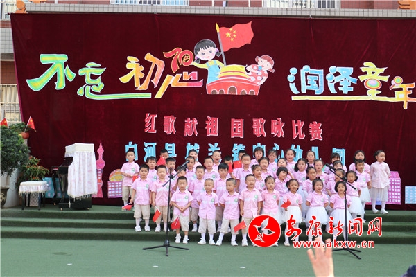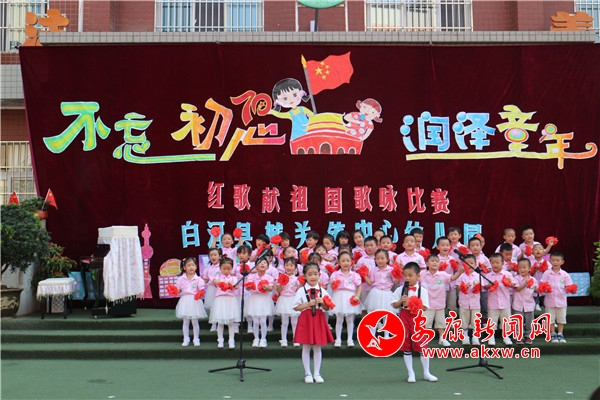 本网讯 (通讯员 贺茂丽)七十载砥砺奋进,七十载光辉征程。在祖国七十华诞即将来临之际,白河县城关镇中心幼儿园于9月30日举行“不忘初心,润泽童年”歌咏比赛向祖国母亲的生日献礼。