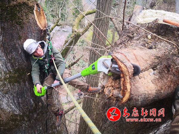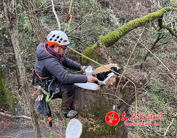 “在修复期间,我们聘请了国内最顶尖的攀树师、修剪师,攀登到树顶,对树体的枯枝、病腐枝进行了清理,然后对所有树洞存在腐烂的地方,使用消毒灭菌的药物进行处理,对影响树体生长,可能造成二次伤害位置的漏洞、树洞进行了封堵。我们使用的攀树、修剪技术目前在我们陕西省内属于首次的应用,通过这次修剪之后让阳光照进伤口,使古树再次萌发了蓬勃生长的动力”,白河县林业局自然保护地管理办公室主任肖培军介绍说。
