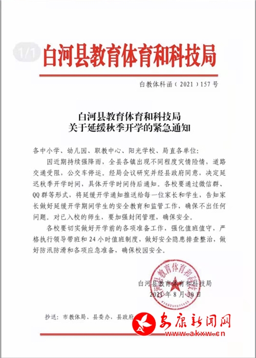 本网讯 因近期持续强降雨,白河全县各镇出现不同程度灾情险情,道路交通受阻,公交车停运。8月30日,白河县教育体育和科技局发布《关于延缓秋季开学的紧急通知》(以下简称《通知》),决定延迟秋季开学时间,具体开学时间待后通知。