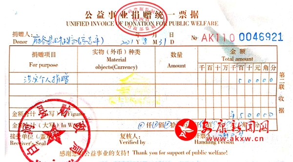 据悉,这笔特殊捐款来自2020年时任陕西省府谷县财政局副局长高志平。在当年全省脱贫攻坚交叉检查时,白河县脱贫攻坚资金绩效检查组被抽调检查府谷县,在近一个月的时间里,高志平与检查组成员们同吃同住、相互配合,高质量完成了检查任务,也结下了深厚的兄弟情义。在得知白河县受到暴雨天气影响,多地发生灾情时,他心急如焚,一直用微信与白河县的同志们交流了解情况。当得知本次白河受灾严重时,他第一时间表示要求捐款,委托白河的同志帮忙通过微信转账进行捐款,知道捐赠成功后,高志平心里的一块大石头终于落地,他高兴地说:“只是做了自己力所能及、量力而行的事,希望更多的人都能献出一点爱,帮助灾民渡过灾情。”