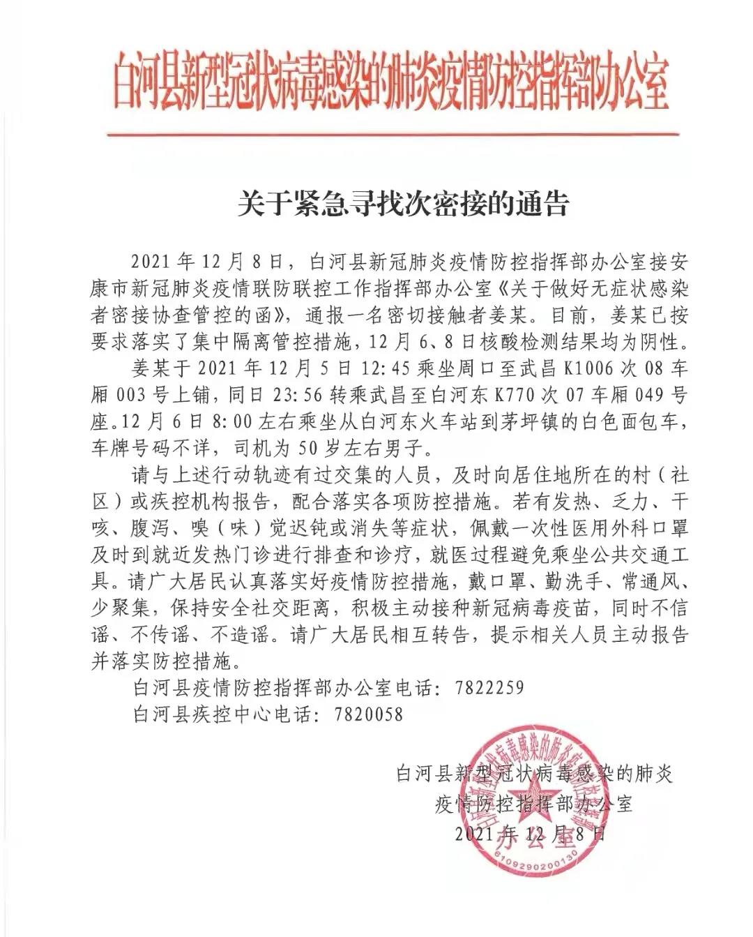 2021年12月8日,白河县新冠肺炎疫情防控指挥部办公室接安康市新冠肺炎疫情联防联控工作指挥部办公室《关于做好无症状感染者密接协查管控的函》,通报一名密切接触者姜某。目前,姜某已按要求落实了集中隔离管控措施,12月6、8日核酸检测结果均为阴性。