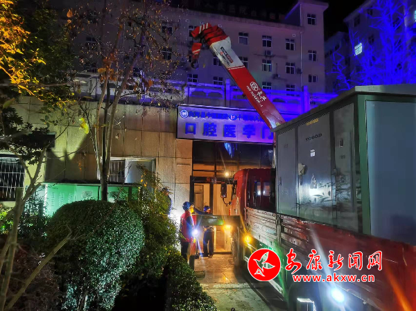 国网白河县供电公司立即组织人员前往医院查看故障情况,发现医院专变的变压器因高负荷烧毁,需要更换变压器。下午7时,工作人员一边帮助医院协调转运变压器设备,一边紧急调用一台50千瓦的发电车,并迅速为医院进行电源接入,第一时间为医院的核酸检测点、疫苗冷藏室、急诊等优先供电。