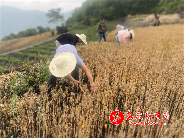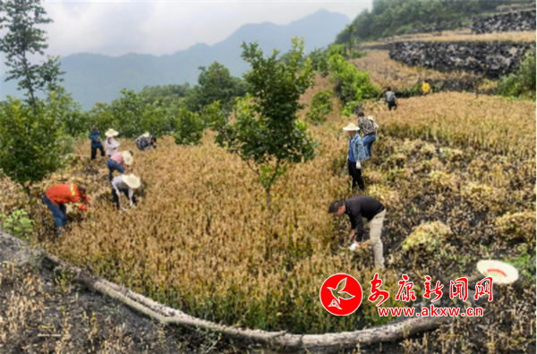 “放心吧,有我们帮忙,今儿上午就能把你家这小麦收完!”带队的镇组织委员周汉梅笑着劝慰老陈。身形娇小的她干起活来毫不含糊,动作麻利极了。只见她左手拢麦,右手不停地挥动镰刀,在不间断的“刷刷刷”声中,一片片小麦应声倒地,老陈则是用事先打好的“约子”将被“放倒”的小麦捆成“麦个子”,待收割完后齐齐运回家晾晒。