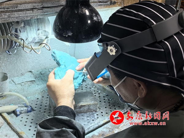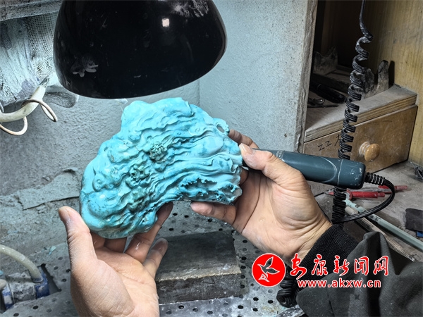 中国宝石琢玉艺术家徐安对白河绿松石进行雕刻