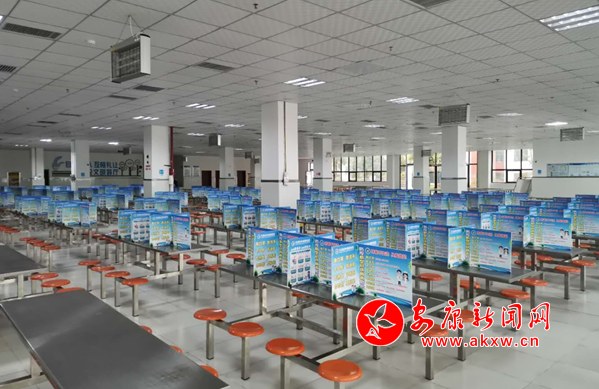 学校在食堂复工前,对食堂工作人员实施了严格的健康筛查。工作中严格按照每日监测消毒措施,做好个人健康监测。食堂内环境卫生及餐具消毒,做到谨慎细致。师生就餐前,统一按要求洗手,取餐窗口一路列队,且前后左右间距1米。就餐时每桌采用挡板进行隔断,避免面对面交叉。取餐就餐均分级分班错峰错时进行,避免人员聚集。