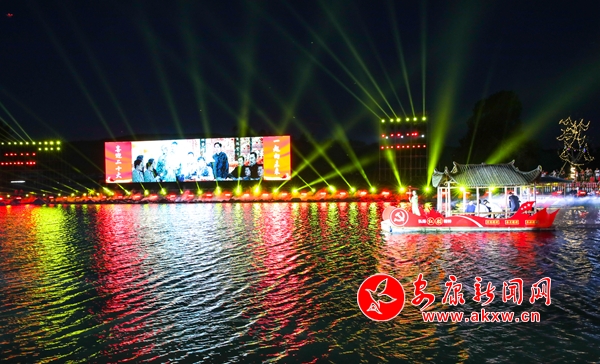 晚会在嘹亮激昂的独唱《东方红》中拉开序幕,紧接着,磅礴大气的歌舞串烧《我和我的祖国》《万疆》《爱我中华》,如诗如画的水上表演《南湖红船》《江南水乡》《滚滚长江东逝水》,动力澎湃的RAP时尚秀《门户新安康》,美轮美奂歌舞表演《我的深情为你守候》《为祖国干杯》《送你一个长安》《我爱你,中国》《领航》等节目相继登台表演,与此同时,绚丽多彩的灯光秀和仙气飘飘的雾森特效穿插其中,不断将演出推向高潮。最后,整场演出在大合唱《没有共产党就没有新中国》的歌声中圆满落下帷幕。