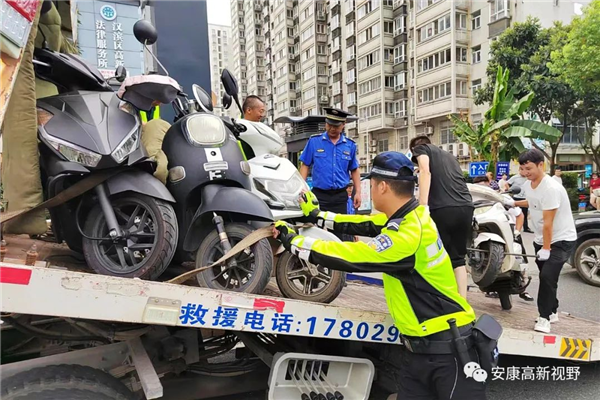 针对车辆乱停乱放等交通秩序管理问题,执法人员对花园大道、秦岭大道、学府路、高新四路等主次干道沿线开展全天候整治,并向沿街商户下发摩托车、电动车规范停车告知书。对占用人行道、消防通道、公交泊位等行为进行拍照取证后强制拖移。同时,向市民群众发放文明交通宣传彩页,引导大家自觉摒弃交通陋习、遵守交通法律法规,安全文明出行。