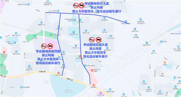 1、花园大道(安康大道至世纪大道)、世纪大道(新路口环岛至五路口环岛)、高新四路,所有通行车辆于6月6日21时至6月8日21时,无论遇到何种情况,一律禁止鸣笛,禁止大中型货车、危化品运输车通行。