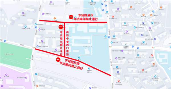 高新中学所处的学苑路东段、永定路全段、高新中学西侧道路进行交通管制,禁止所有车辆通行。