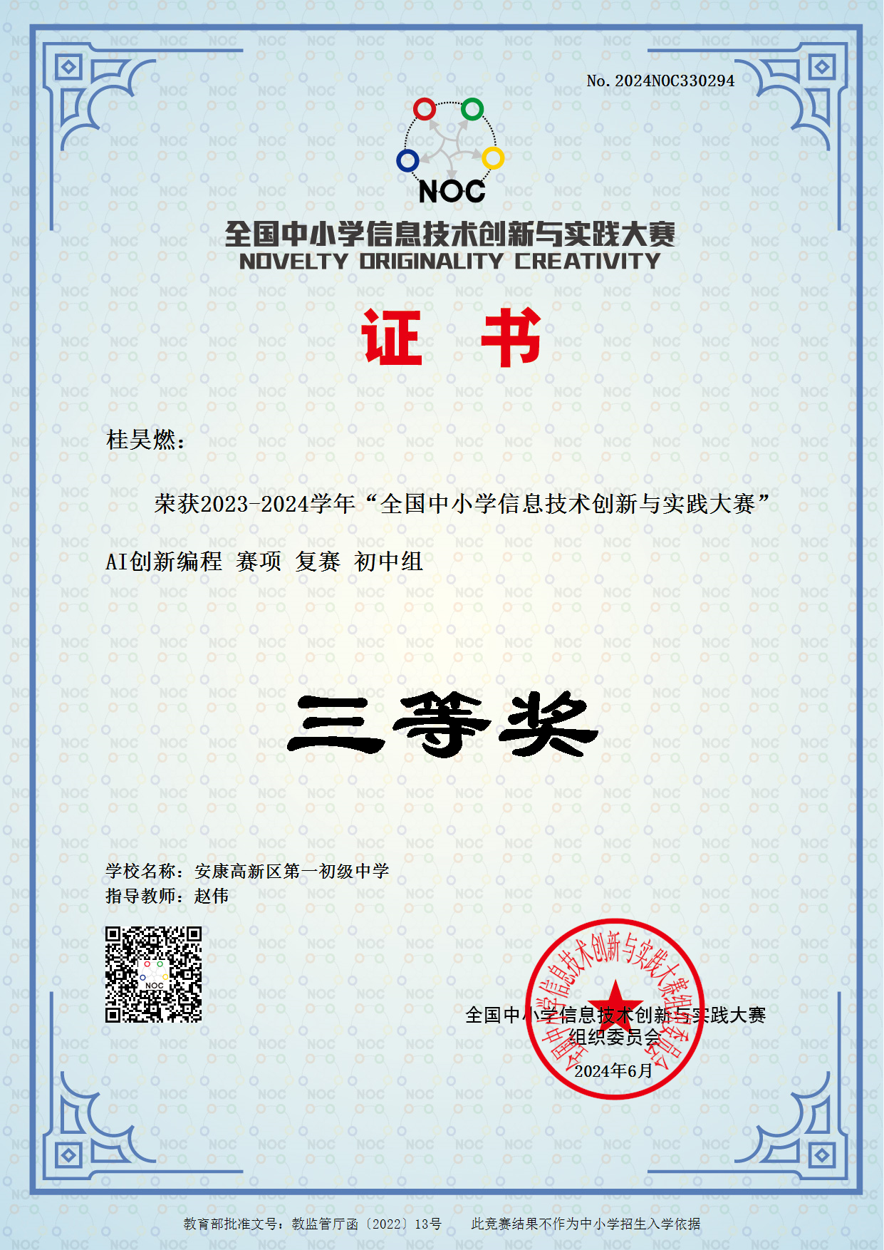 本网讯(通讯员 赵伟)近日,高新区第一初级中学桂昊燃同学在全国中小学信息技术创新与实践大赛复赛中荣获三等奖,该生由赵伟老师指导。iNC安康新闻网