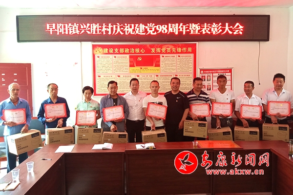本网讯 (通讯员 汪丁 袁朝宁)为庆祝中国共产党成立98周年,激励广大党员干部永葆政治本色,凝聚决战决胜脱贫攻坚的决心和力量,6月18日,汉滨区早阳镇兴胜村联合汉滨区市场监督管理局举行庆祝建党98周年暨表彰大会。