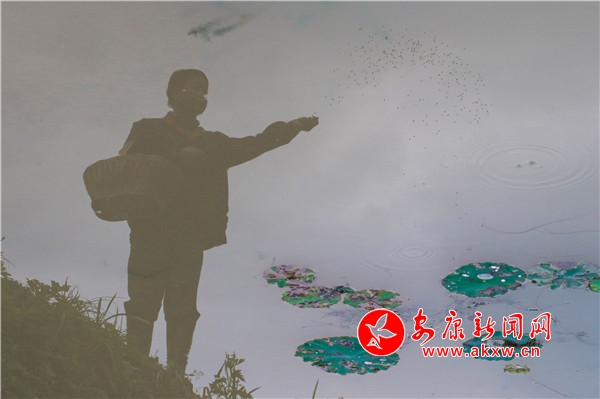 10月12日,汉滨区县河镇财梁社区三分良田虾稻园内工人正在喂养小龙虾。
