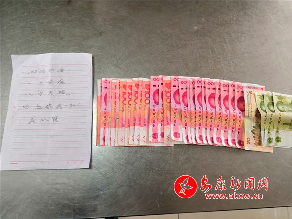 打开纸包,里面是整整齐齐的一沓钱,还有一个纸条。纸条上写着:“湖北加油!一方有难,八方支援。勿忘安康7.30!工资”。
