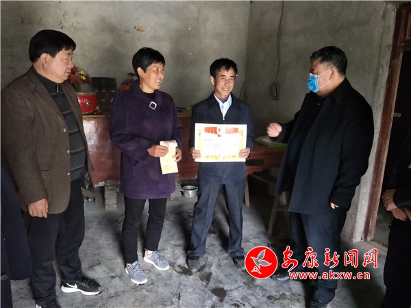 本网讯(通讯员 王聪)3月24日上午,汉滨区退役军人事务局局长马泽兴和早阳镇人大主席刘化波等一行数人,专程来到早阳镇店子沟村,为再次荣立个人三等功的早阳籍现役军人黄开波家属送去喜报和慰问金。