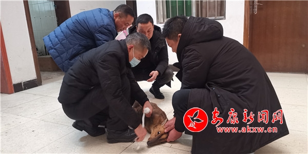 接到报告后,大竹园镇派出所、农综站、综合执法办公室三部门联合出动,迅速赶往现场,通过现场比对鉴定,发现这只小动物是国家二级野生保护动物麂子。为稳定麂子伤情,工作人员现场进行了伤口处理,并将其带回镇农综站邀请兽医进行诊治。