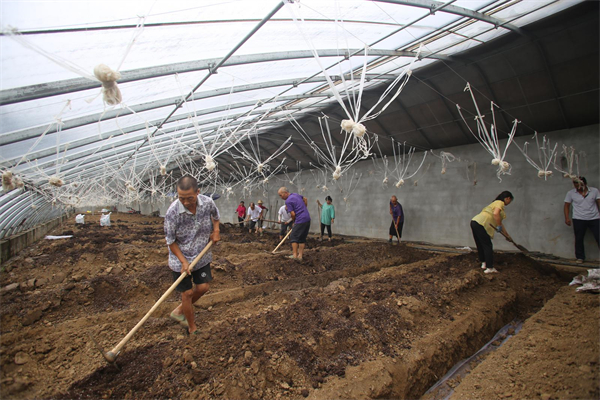 村民正在大棚里施有机肥。
