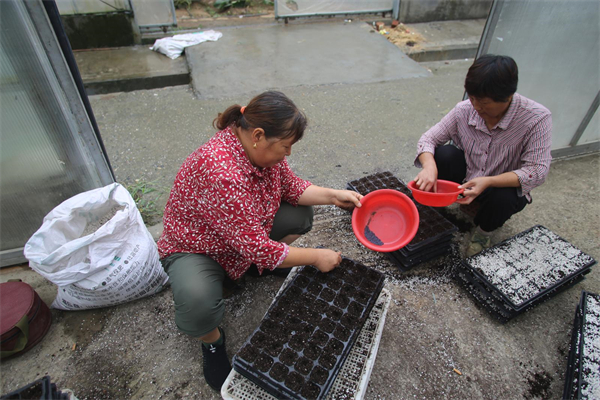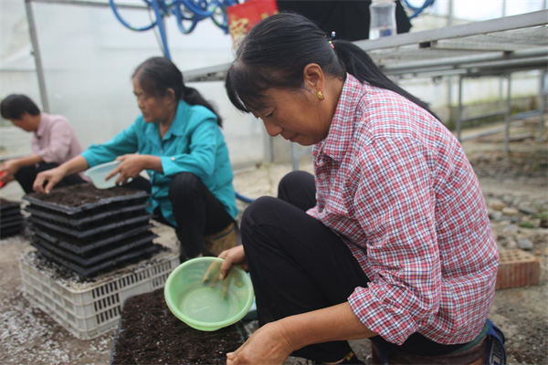 村民正在蔬菜大棚里点籽育种。