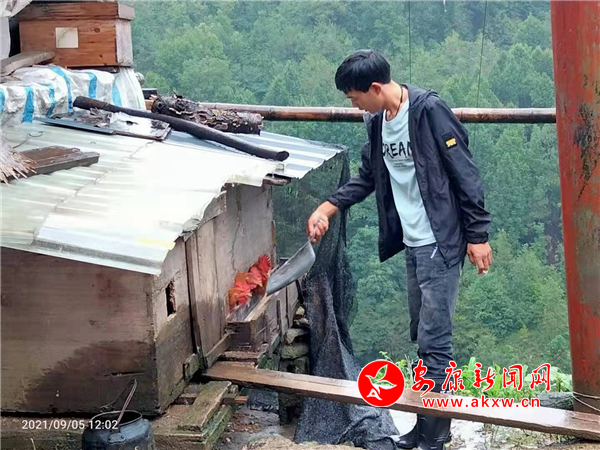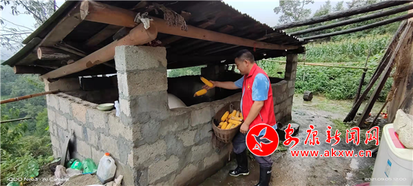 第二天一早,刚刚从防汛重点警示区完成排查的朱文杰一边喊着“柯亮,骑上摩托,我们去给唐第礼把猪和鸡喂了”,一边换下早已被雨水打湿的外套,披上一件志愿服背心,勉强抵御阵阵袭来的凉意,撑上那把“外面下暴雨,里面下小雨”的大红伞,匆匆赶去兑现当“饲养员”的承诺。