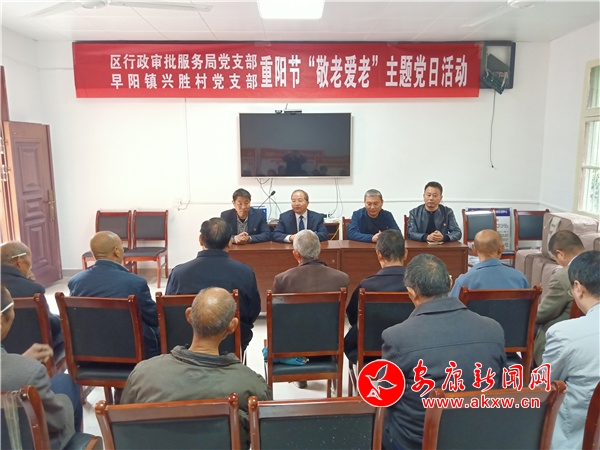 本网讯(通讯员 唐琼)为大力弘扬中华民族尊老敬老爱老的光荣传统, 10月14日上午,汉滨区行政审批服务局党支部联合早阳镇兴胜村党支部在该村开展重阳节“敬老爱老”主题党日活动,为老党员送上了节日的问候和祝福,让老党员们感受到党组织的关怀和温暖。