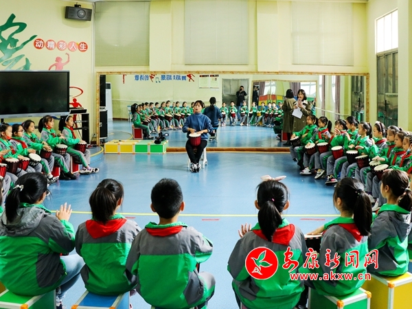 “同学们好,经过前面的学习,大家已经熟练地掌握了非洲鼓低音和中音的打法,今天我们一起来学习高音的打法,打高音时手指自然张开,但不要张的很大,在打击时要······”10月14日下午16:20,汉滨区果园小学非洲鼓社团汪倩老师正在教学生非洲鼓演奏,孩子们热情专注地拍打,富有节奏感的鼓声飘荡在校园上空。这是该校落实“5+2”模式素质拓展服务的一个缩影。
