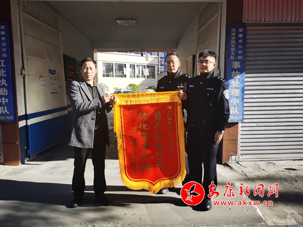 本网讯(记者 唐正飞)11月9日,中心城区安康市公安局汉滨分局交警大队事故处理中队门口,安徽籍市民燕明辉一行将一面印着“勇于担当作为,优化营商环境”的锦旗送给办案交警手中。
