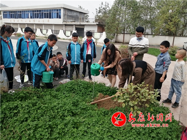 在接下来的植绿活动中,同学们个个都抢着争当环保小卫士,干劲十足。看小斌同学拿起挖掘把树坑挖的大大的,魏依晨同学把果树苗扶的直直的,还有许多同学运水、浇水、培土。在师生共同努力下,校园变得更绿了,更靓了。