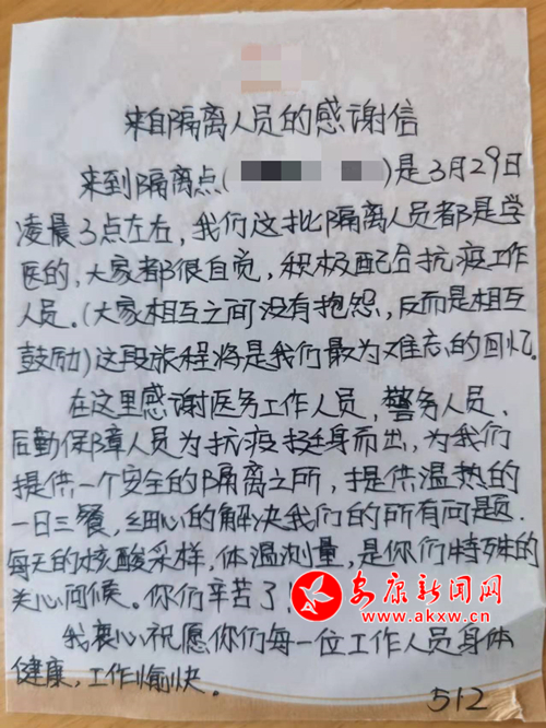 “感谢医务人员、警务人员、后勤保障人员为抗疫挺身而出,为我们提供一个安全的隔离之所……你们辛苦了!”这是4月6日张滩镇隔离点抗疫工作人员收到的一封感谢信,百余字言短意真,饱含着被隔离群众满满的敬意与感谢。