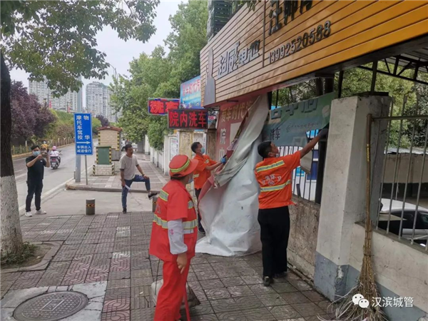 各城管执法大队结合辖区特点,围绕提升街面视觉形象和维护一江两岸景观形象重点保障任务,结合全天候不间断巡查和重点值守措施,规范门店、商铺和摊贩经营行为,整饬便民市场周边秩序,确保人行道环境整洁、秩序井然;实施破损和违规户外广告集中治理,先后拆除黄沟路、滨江路等处各类发光字、喷绘、钢架等户外广告59块,拆除人行道护栏、商铺门头、街巷上空、工地围挡等处所的条幅、喷绘等软体广告200余条,切实提升中心城市视觉观感。