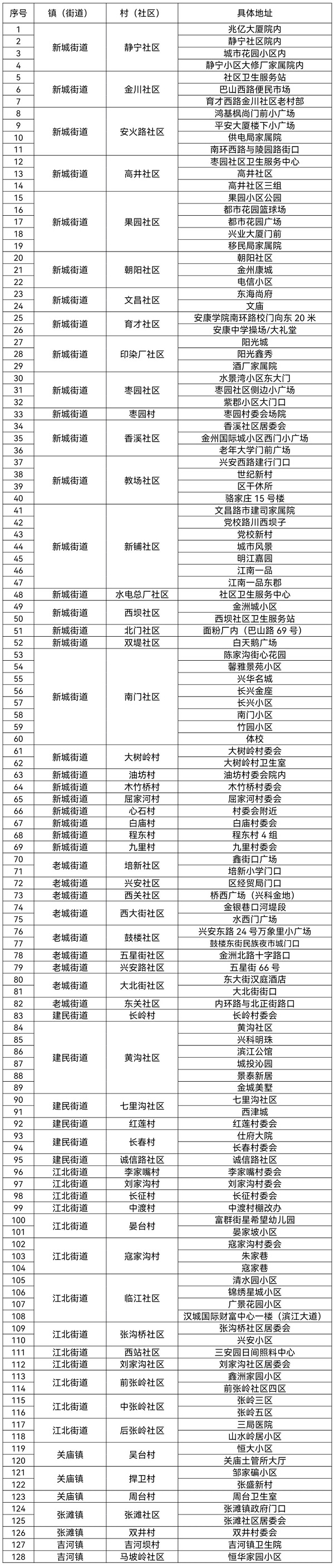 汉滨区老城街道、建民街道、新城街道、江北街道及张滩镇、关庙镇、吉河镇中心城区范围(具体见附件所列村、社区)常住和流动人员一律参加核酸检测。