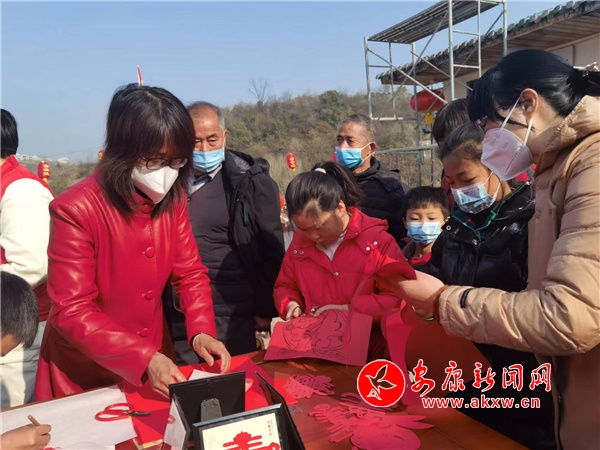 除了精彩的文艺表演,来自汉滨区文化馆的驻村帮扶工作人员还组织了该馆业务干部和非遗传承人开展写春联、剪窗花、玩社火、印版画、包饺子等民俗活动,让村民们流连忘返。书法家们挥毫泼墨,以书写春联和“福”字的方式为村民们送上新春祝福;窗花、版画的互动活动也吸引了不少村民们的驻足围观,来自汉滨区文化馆的文化志愿者们现场示范讲解,一幅幅精美的作品在他们手中呈现,有的还没完工,就已被围观的村民们抢先预定……