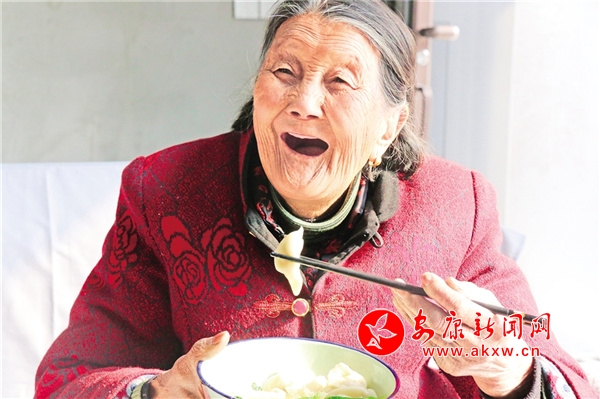 李增富前脚刚进门,我们也随着他走进屋,接过儿子递过来的饭碗,母亲一口一口慢慢吃着饺子,“这饺子香,我一次能吃十几个呢。”虽然耳朵听不清,但是老人对食堂的饭菜赞赏有加。