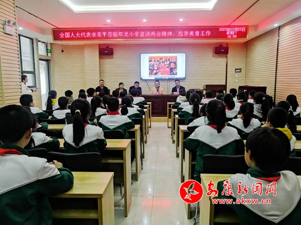 期间,宋亚平借助参会图片,向双龙镇师生宣讲了2023年全国“两会”盛况及主要精神,希望山区学校组织师生深入学习宣传“两会”精神,迅速把思想和行动统一到全国“两会”决策部署上来,认真贯彻党的教育方针,落实立德树人根本任务,坚持“五育并举”,建立美育基地长效运行机制,坚持以赛促学,坚持美育与研学融合发展,扎实推进学校美育工作走深走实,引领乡村学校特色发展、内涵发展;勉励山区学生感恩奋进,树立远大志向,刻苦学习,用知识改变命运,用心观察身边生活,用心创作展示乡村之美,抒发对美好生活的向往,展现爱党、爱国、爱家乡的情怀,在美育的熏陶下全面发展,努力成为德智体美劳全面发展的社会主义建设者和接班人。