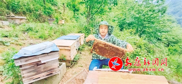 养蜂人叫江鑫,是一个很精神、干练的小伙子。他曾经是一个建档立卡贫困户,在政府扶持政策下,发展养蜂事业,如今成了黄泥村的致富能手、养蜂“状元”,仅养蜂一年就收入20多万元,并且带动周围30多户群众发展养蜂产业。