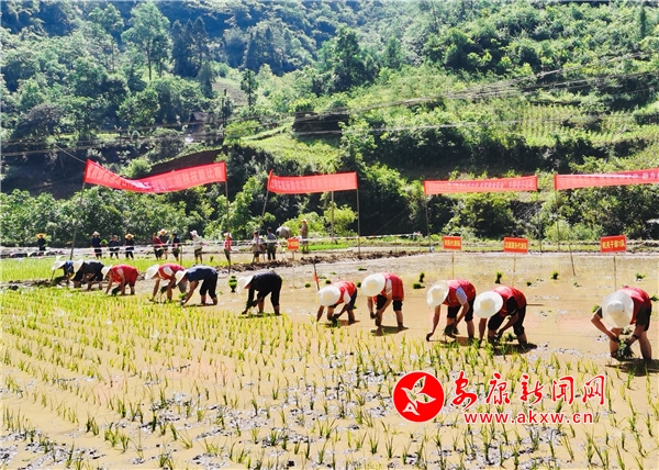 “传承农耕文化 共筑粮食安全。”活动现场,干部群众热情高涨,干劲儿十足,协同进行水稻秧苗移栽,每支队伍参赛选手在田间横向排列,埋头弯腰,按照“浅、直、满、匀、齐”的标准,一手拿着稻苗,另一手快速从中分秧、插秧,脚步过处,一排排绿油油的秧苗在田间均匀落下。