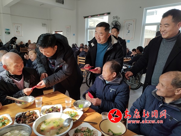 中午11点,“客人”准时而至。“大家新年好!给大家拜年了!一会儿咱们一起吃团年饭!”早阳镇党委书记金鑫和副镇长陈志恒刚走进敬老院,就热情地挥着手和老人们打着招呼。走进敬老院的餐厅,一股浓浓的香味扑面而来,十张桌子上早已整齐地摆放着丰盛的菜肴,红苕蒸肉、红焖肘子、红烧鸡块、八宝饭、凉拌菠菜……红的绿的摆满整张桌子,让人赏心悦目。
