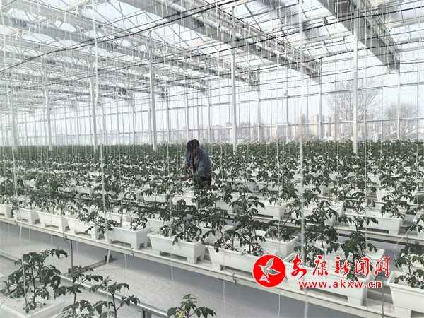 据介绍,绑蔓作业是为了给圣女果苗一个向上生长的支撑,圣女果苗高度会长到五至七米,每摘一至两层果,就要落蔓。这样的种植方式有效地增加了空间面积。