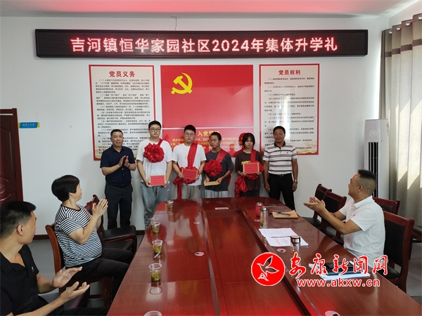 8月16日,汉滨区吉河镇恒华家园社区举行“弘扬新民风 拒绝升学宴”大学新生集体升学礼活动,为4名本科大学新生发放了助学金和纪念品,并签订了“弘扬新民风 拒绝升学宴”承诺书,用集体升学礼代替“升学宴”,争做拒绝“升学宴”的践行者和推动者,营造健康文明、勤俭节约的良好社会新风尚。(图文/刘化梅) jzp安康新闻网