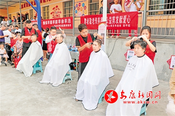 现场,通过有奖问答、发放宣传资料、设立咨询台等形式,向村民进行平安建设、普法、反诈等宣传。来自汉滨区阳光爱心护理院的志愿者们为老人们提供健康指导。爱心人士龚甲超组织的义剪活动也受到了老人们的欢迎,志愿者们免费为现场50多名老人理发。书法家们现场围绕“孝义”主题进行创作,并赠送给群众。演出结束后,近百名老人到社区的孝义食堂参观和免费用餐。