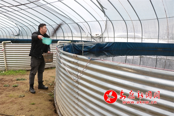 双龙社区东粮和谐养殖农民专业合作社负责人刘东粮正在喂鱼