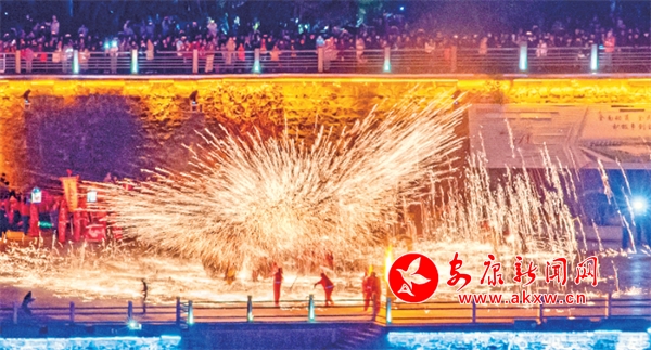 来自宁陕的打铁花表演将现场气氛推向高潮。宁陕县民间社火协会副会长张宜君说:“在安康市区来一场打铁花还是第一次。我们上场共有6个人,给全市人民打铁花、拜新年。”