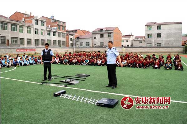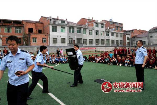 在活动过程中,该所副所长陈小兵先进行了法律知识讲座。讲座中,陈所长针对青少年犯罪的性质、特点、根源,结合青少年的生理、心理特征,以生动的事例,详实的资料,通俗的语言,解读了一个个触目惊心的青少年犯罪案例,给学生上了一堂生动的法制教育课。紧接着公安民警又向师生们展示了催泪喷射器、警棍、钢叉、阻车器等警用装备并模拟在遇到坏人时应如何正确使用这些警用装备以便最迅速、有效地将坏人制服,师生们听得聚精会神,博得了师生的阵阵掌声。