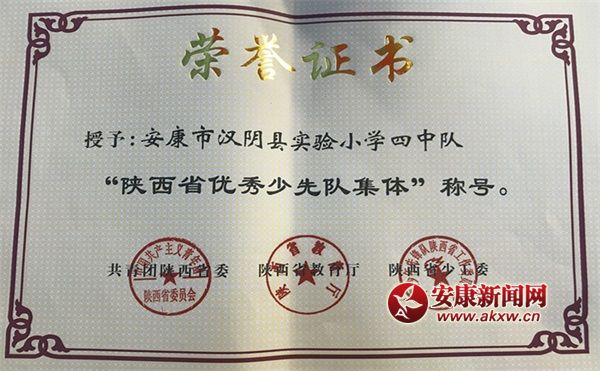 据了解,汉阴县少先队工作除获省级表彰外,还有7名师生,2个学校分别荣获“安康市支持少先队工作好校长、安康市优秀少先队集体、安康市优秀少先队辅导员、安康市十佳少先队员”等荣誉,汉阴县平梁初级中学团委同时还荣获安康市“五四”红旗团委荣誉称号。