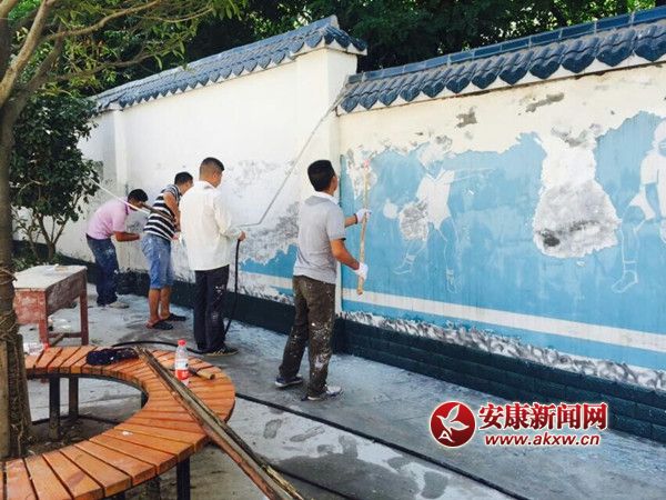 原来这是该校校园围墙美化工程正在紧张的实施当中,尽管酷暑难当,但学校领导依然坚守岗位,工人师傅们更是挥汗如雨,认真细心地做好每一道工序。该校近年来校园基础设施建设发生了显著变化,特别是总面积达12亩的塑胶操场建成后,更是让原本清新整洁的校园新增了一道亮丽的风景线。让人感到美中不足的是原有500余米的围墙墙面有些斑驳陈旧,学校积极争取项目资金,并于7月4日正式开始对围墙进行“美化”,秋季开学之际,重返校园的师生将会看到一扇扇崭新的、充满人文气息的文化宣传墙。